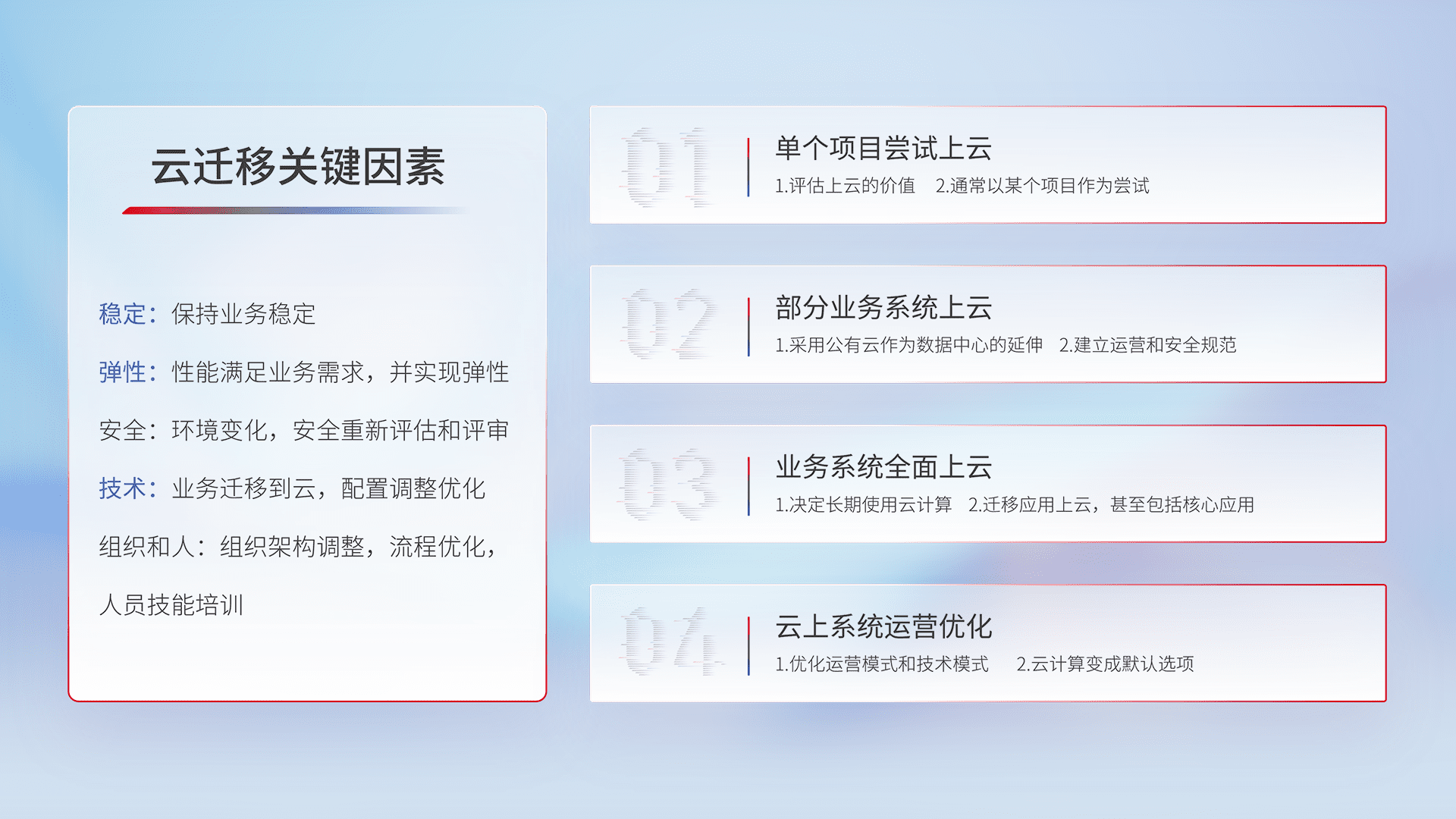 结合实际业务,,,,从规划设计、、、、云平台选型、、、云原生改造、、、、数据迁移、、、、集成交付,,,,迁移全过程为客户识别最佳上云路径,,做好风险识别管理,,,,设计网络架构、、、、身份权限、、、、安全审计合规、、操作审计、、、、日志审计、、监控告警策略、、、、多站点容灾设计等,,对云上基础设施进行整体规划,,,,提升IT治理水平,,,以满足弹性、、高可用、、、、高性能的需求。。。